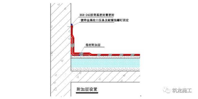 平立面交接处、转折处需设置防水专用附加层(材质与大面卷材相同或相溶),附加层卷材与基层需满粘,卷材在临时保护墙部位点粘临时固定,详见下图所示: