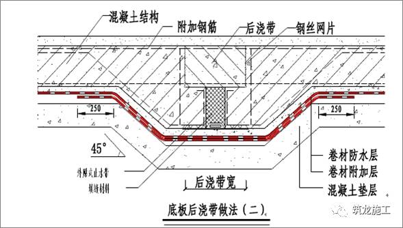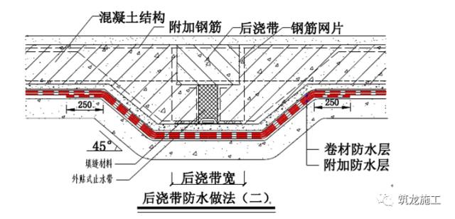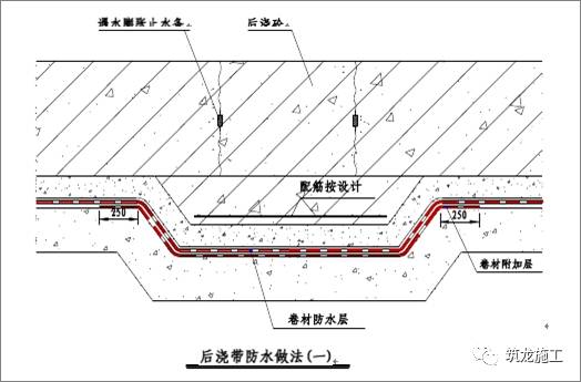 在后浇带位置增铺与大面同材质的卷材作附加增强层,附加层宽度大于等于500mm,如下示意图所示: