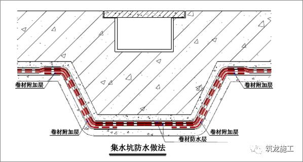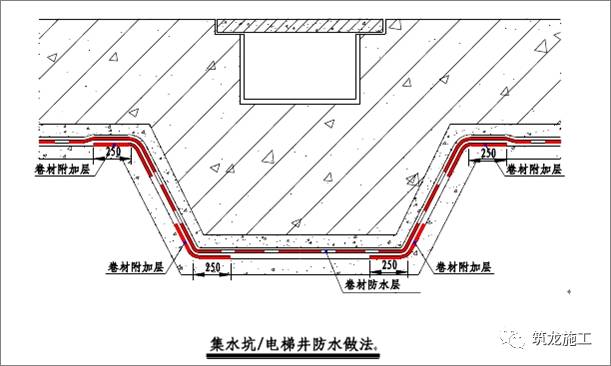 在电梯井及集水坑的阴阳角转折处设置与大面同材质的卷材作附加增强层,附加层宽度大于等于 500mm,如下示意图所示: