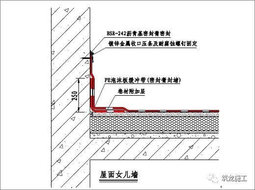 屋面女儿墙附加层采用与大面同材质的防水卷材,热熔满粘施工,附加层宽度为平立面均 250mm 宽。卷材防水层收头需超过附加层高度,具体高度视现场情况而定,有压顶的需收头至压顶下端;无压顶的需上翻至女儿墙上表面,女儿墙过高且无压顶时,可根据屋面防水层上部的其它构造层厚度,确保防水层完成的泛水高度不小于 250mm 的部位留设凹槽,将卷材防水层收头压入凹槽内。以上所有收头做法均需用金属压条钉压固定并用密封材料封严(见卷材收口方式)。