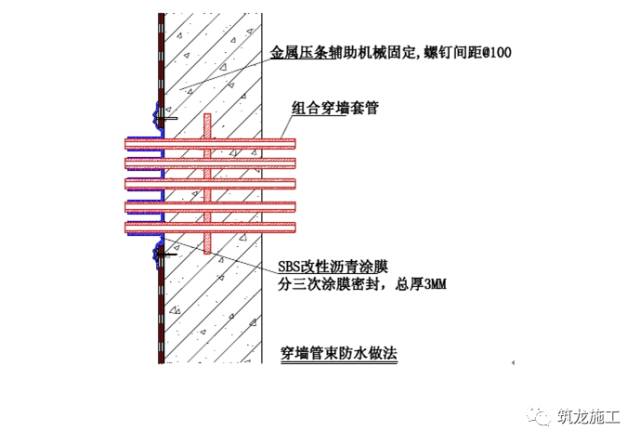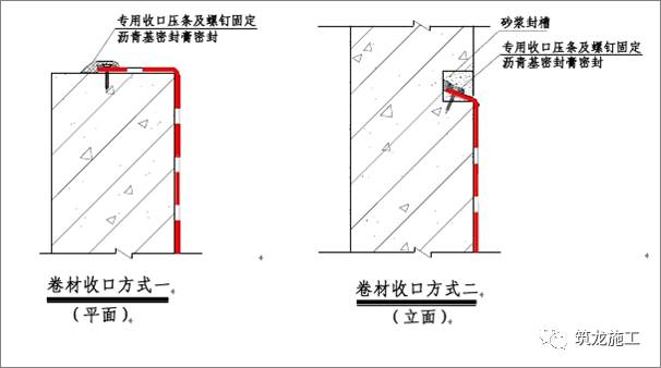 外墙立面卷材的收口采用固定压条、射钉固定、并用沥青基密封膏密封,在保证防水系统的安全性能的前提下,对延长防水系统的安全使用寿命起到极大的帮助。本工程建议侧墙收口为室外地坪以上 500mm,柔性防水层收头,如下图所示:卷材防水系统的终止收口采用特制收口压条,其作用有二,一为取得永久性密封的收口,二为提高与外装饰材料的过渡衔接。