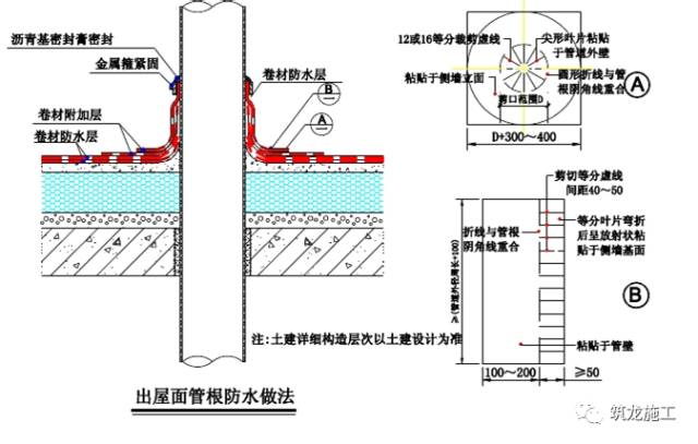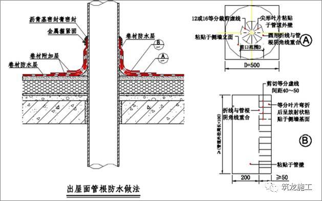 大面卷材施工后管根部位需按下图设置附加层,具体做法是先根据管根直径按 A 图将卷材裁剪 12 或 16 等分,并穿过管根热熔满粘至平面;再按 B 图中做法裁剪好后整个包住管道外部,底部裁剪好的部分热熔满粘至平面。
