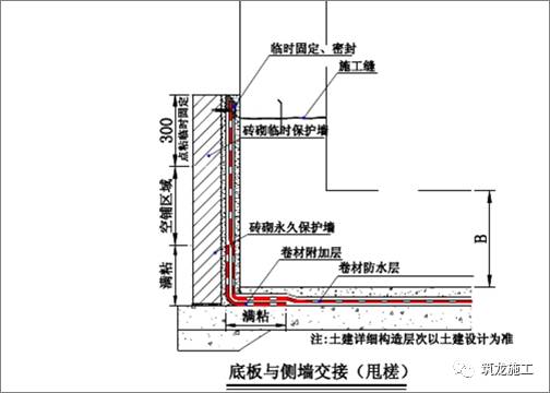 对转角处以及平立面交接处、转折处设置附加层卷材,底板卷材与砖砌永久保护墙之间刷油满粘施工,卷材在临时保护墙部位点粘临时固定,详见下图所示: