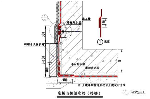 卷材收口部位采用砖体进行临时固定,待立墙施工时拆除临时保护,与底板卷材接茬宽度不小于 150mm,立墙卷材建议采用柔性保护。